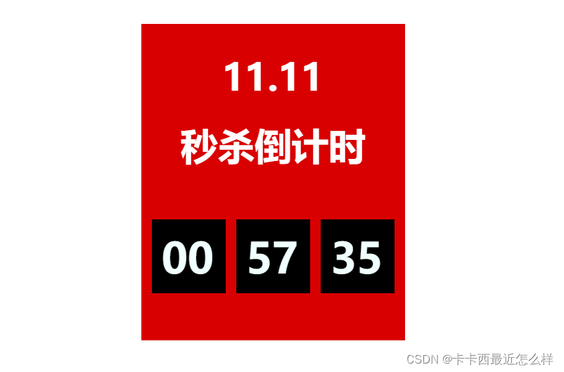 <!DOCTYPEhtml><htmllang="en"><head><metacharset="UTF-8"><metahttp-equiv="X-UA-Compatible"content="IE=edge"><metaname="viewport"content="width=device-width, initial-scale=1.0"><title>Document</title><style>*{ margin: 0px; padding: 0px; } .box{ box-sizing: border-box; margin: 100pxauto; width: 500px; height: 600px; background-color: rgb(216, 0, 0); } .top{ box-sizing: border-box; width: 500px; height: 350px; padding: 5px; padding-top: 35px; text-align: center; line-height: 130px; font-size: 70px; color: rgb(255, 255, 255); font-weight: bold; } .bottom{ padding: 10px; } .left{ box-sizing: border-box; margin: 10px; float: left; width: 140px; height: 140px; background-color: rgb(0, 0, 0); color: azure; padding: 19px; font-size: 80px; font-weight: bold; } .center{ box-sizing: border-box; margin: 10px; float: left; width: 140px; height: 140px; background-color: rgb(0, 0, 0); color: azure; padding: 19px; font-size: 80px; font-weight: bold; } .right{ box-sizing: border-box; margin: 10px; float: left; width: 140px; height: 140px; background-color: rgb(0, 0, 0); color: azure; padding: 19px; font-size: 80px; font-weight: bold; } </style></head><body><script>document.addEventListener('DOMContentLoaded',function(){ varhour=document.querySelector('.left'); varminute=document.querySelector('.center'); varsecond=document.querySelector('.right'); timer(); varclock=window.setInterval(function(){ timer(); },1000) functiontimer(){ varnowtime=+newDate(); varaimtime=+newDate("2022-3-8 19:30:00"); time=(aimtime-nowtime)/1000; varh=parseInt(time/60/60%24); h=h<10?'0'+h:h; hour.innerHTML=h; varm=parseInt(time/60%60); m=m<10?'0'+m:m; minute.innerHTML=m; vars=parseInt(time%60); s=s<10?'0'+s:s; second.innerHTML=s; } }) </script><divclass="box"><divclass="top">11.11<br>秒杀倒计时</div><divclass="bottom"><divclass="left"></div><divclass="center"></div><divclass="right"></div></div> </div></body></html>