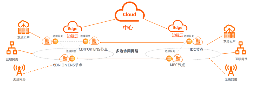 阿里的边缘云基于广泛的节点能力,构建了阿里云的边缘网络,实现了边缘-中心、边缘-边缘、终端-边缘的有效链路,能够支撑其上行的各类业务。