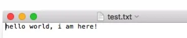 f = open('test.txt', 'w') f.write('hello world, i am here!') f.close()
