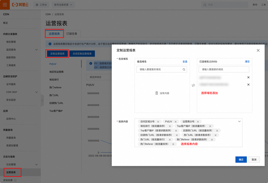 登录CDN控制台,在左侧导航栏,选择运营报表,单击定制运营报表,配置需要生成报表的域名及报表内容即可。