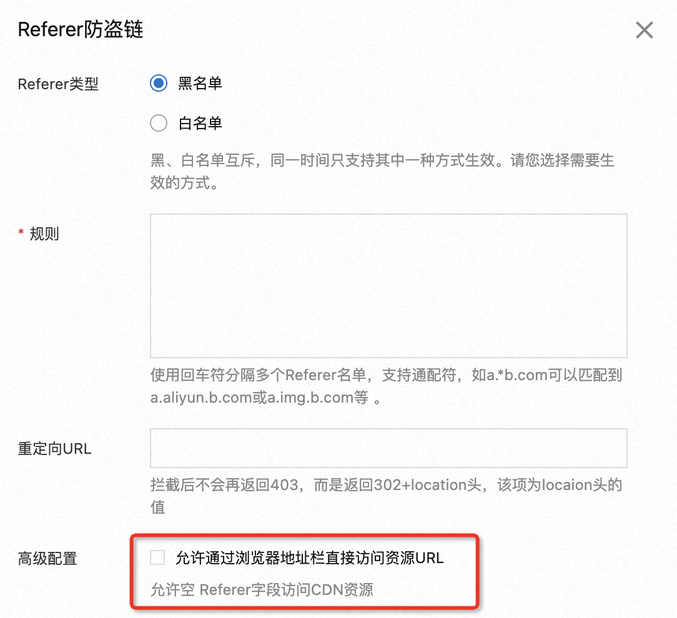 如果您开启了referer的黑白名单,空referer请求对应配置为「允许通过浏览器地址栏直接访问资源URL」,如未勾选,则不允许直接在地址栏访问。