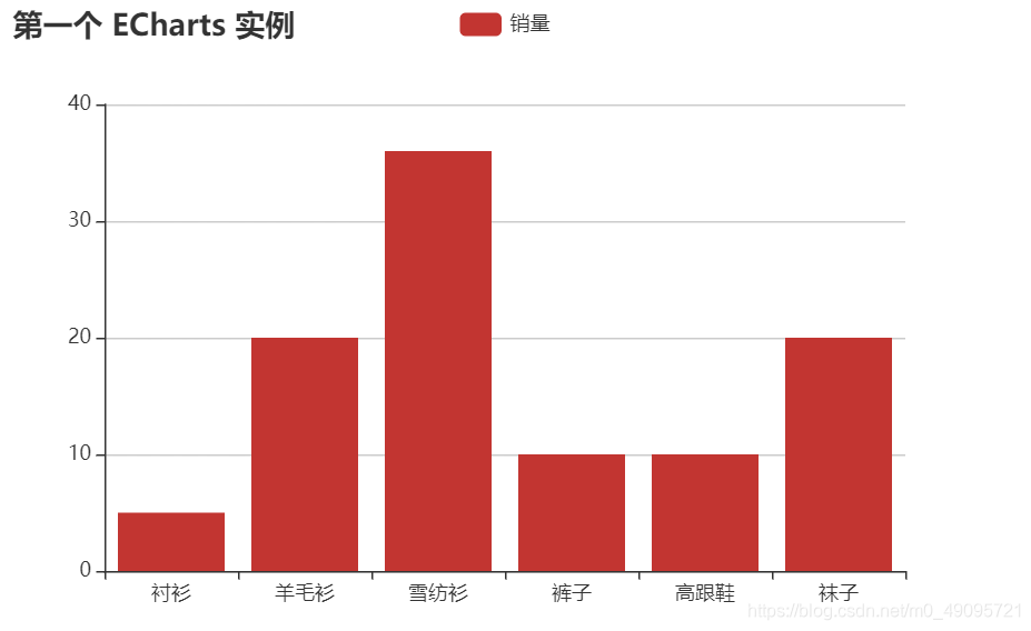 <!DOCTYPE html> <html> <head> <meta charset="utf-8"> <title>第一个 ECharts 实例</title> <!-- 引入 echarts.js --> <script src="https://cdn.staticfile.org/echarts/4.3.0/echarts.min.js"></script> </head> <body> <!-- 为ECharts准备一个具备大小(宽高)的Dom --> <div id="main" style="width: 600px;height:400px;"></div> <script type="text/javascript"> // 基于准备好的dom,初始化echarts实例 var myChart = echarts.init(document.getElementById('main')); // 指定图表的配置项和数据 var option = { title: { text: '第一个 ECharts 实例' }, tooltip: {}, legend: { data:['销量'] }, xAxis: { data: ["衬衫","羊毛衫","雪纺衫","裤子","高跟鞋","袜子"] }, yAxis: {}, series: [{ name: '销量', type: 'bar', data: [5, 20, 36, 10, 10, 20] }] }; // 使用刚指定的配置项和数据显示图表。 myChart.setOption(option); </script> </body> </html>