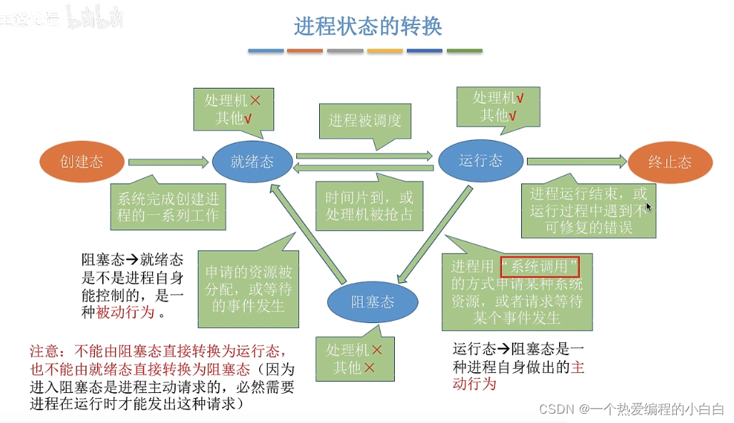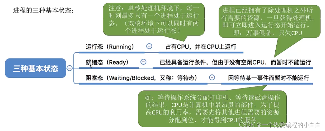 进程是程序的一次执行。在这个执行过程中,有时进程正在被CPU处理,有时又需要等待CPU服务,可见,进程的状态是会有各种变化。为了方便对各个进程的管理,操作系统需要将进程合理地划分为几种状态。