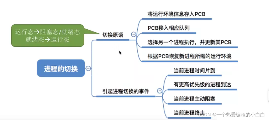 1.更新PCB中的信息(如修改进程状态标志、将运行环境保存到PCB、从PCB恢复运行环境)