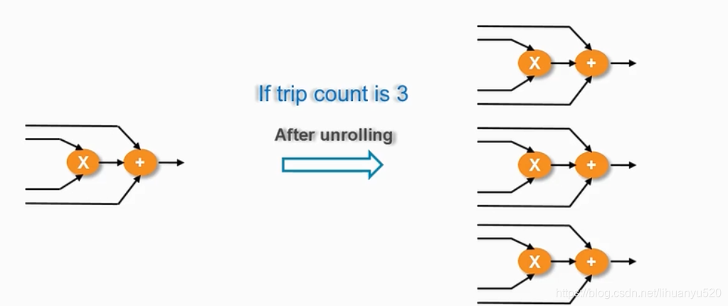 默认情况下,C函数中的For循环是被折叠的,即每次循环均采用同一套电路,它是分时复用的;所谓的展开是复制了多个相同的电路,从而允许所有迭代并行发生。