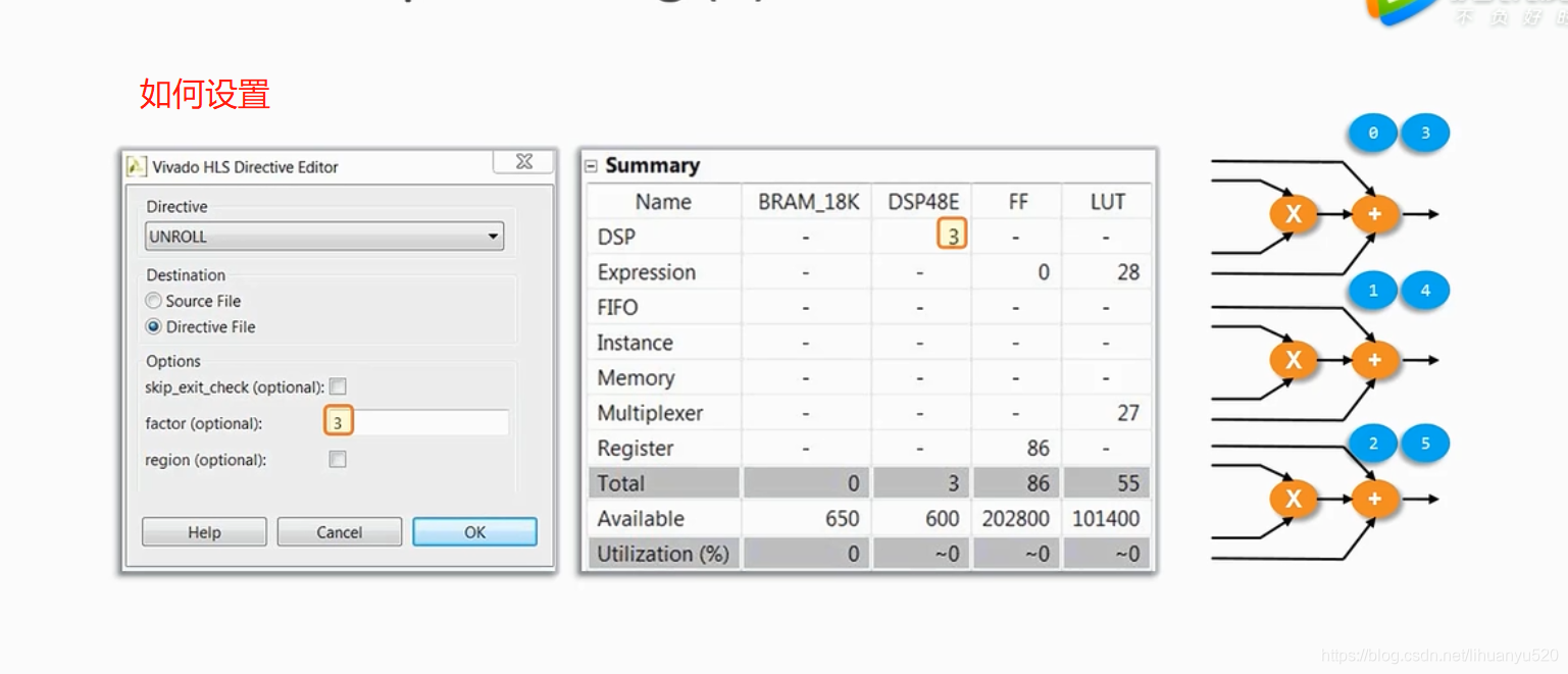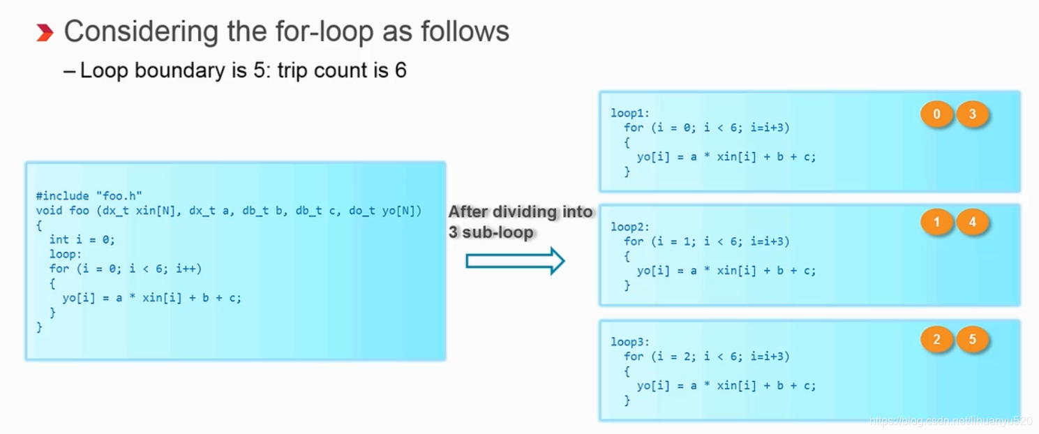 我们也可以把For循环部分展开,如下例所示,将For循环拆解成了3部分,被复制后(0,3),(1,4)和(2,5)分别共用一套逻辑资源。
