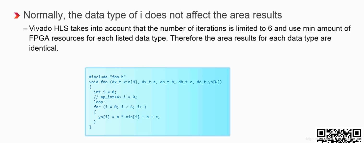 如下例子,Vivado HLS考虑到迭代次数被限制为6次,并为每个列出的数据类型使用最少的FPGA资源。因此,每种数据类型对资源使用情况都相同。