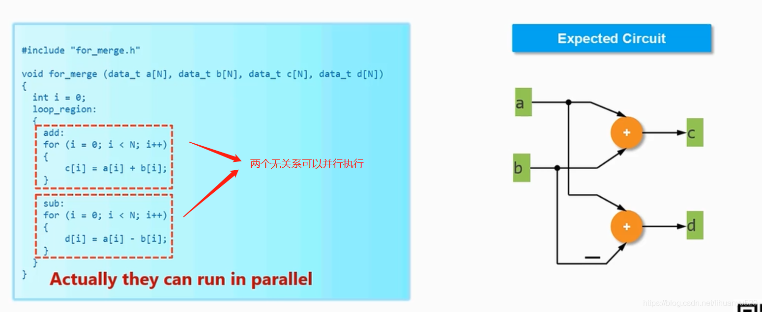 这个例子有两个for循环,这两个for循环分别执行的是加法和减法。他们是可以并行执行的,我们所期望的计算方式为图右所示。