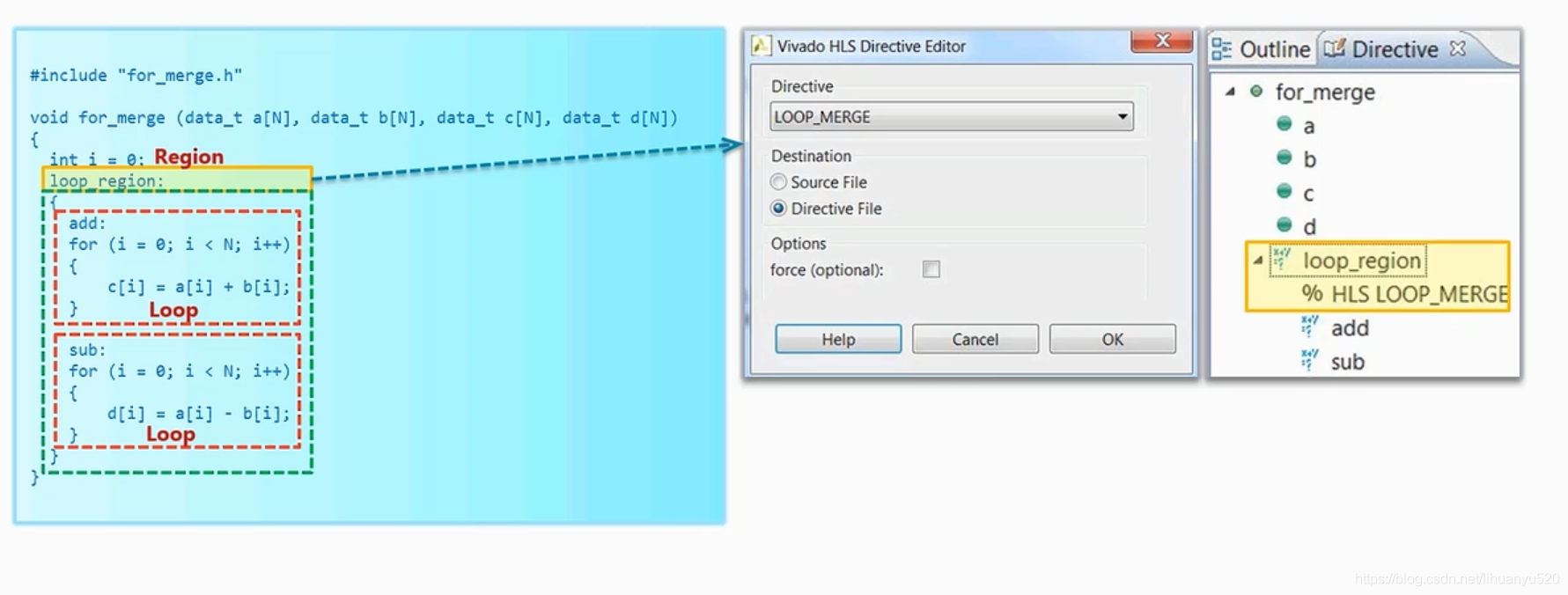 在Vivado HLS提供了一种方式,将for循环进行合并,我们也因此引入了一个新的概念叫做region(下图绿线框对应的部分),这样循环合并部分就是region这一部分。