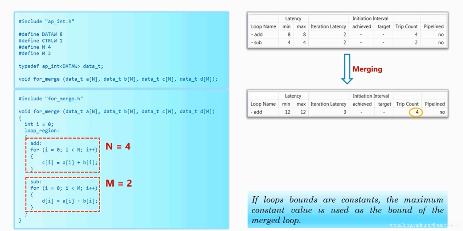如果循环界限是不同常量,则将最大常数值用作合并循环的界限。
