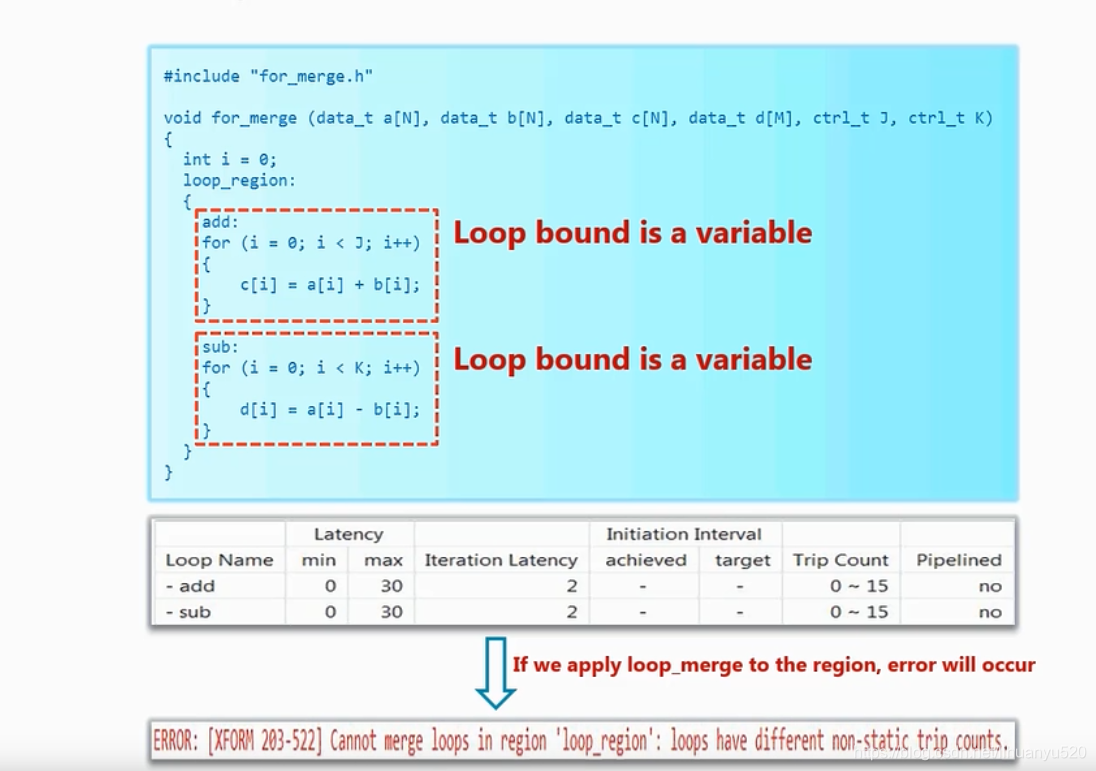 在没有合并时候,我们会发现Trip Count为0~15,这是因为k的变量类型为ap_uint<4>,其数据上限位15。当我们实施循环合并时会报错(无法合并)。这说明变量边界和常数边界无法合并。