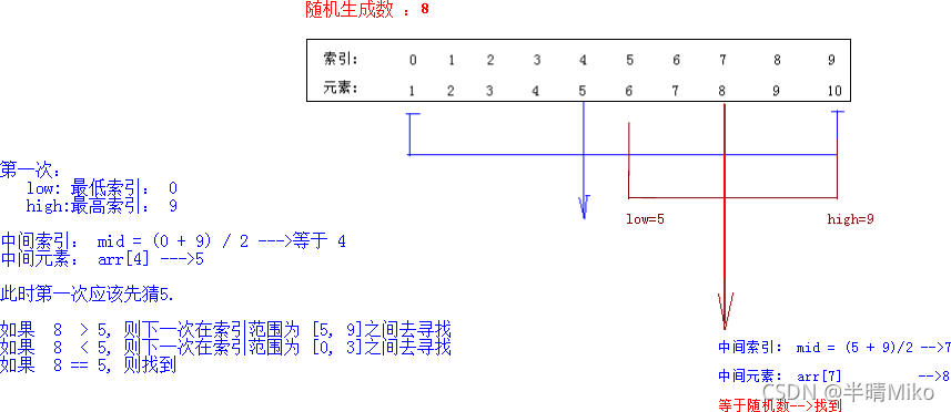 二分法查找(折半查找):前提数组元素是有序的,性能非常优异。