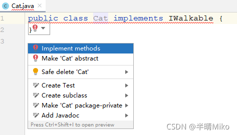 public class Cat implements IWalkable{ public void walk() { System.out.println("走猫步..."); } }