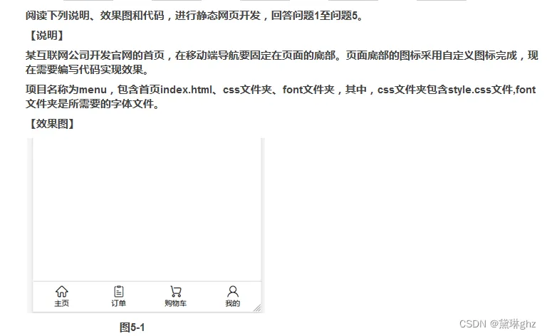 <html><head><title>第五题-移动端底部导航</title><metacharset="utf-8"><metaname="viewport"content="width=device-width,initial-scale=1,maximum-scale=1,user-scalable=no"><linkrel="stylesheet"href="css/style.css"></head><body><footer><divclass="home"><i></i>主页</div><divclass="order"><i></i>订单</div><divclass="shop"><i></i>购物车</div><divclass="user"><i></i>我的</div></footer></body></html>