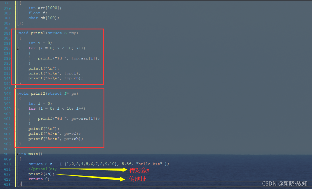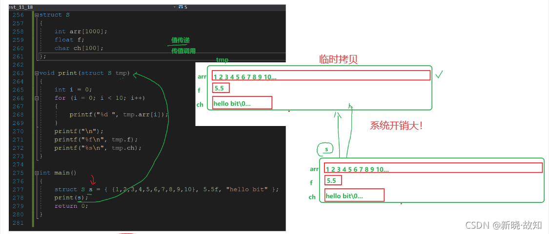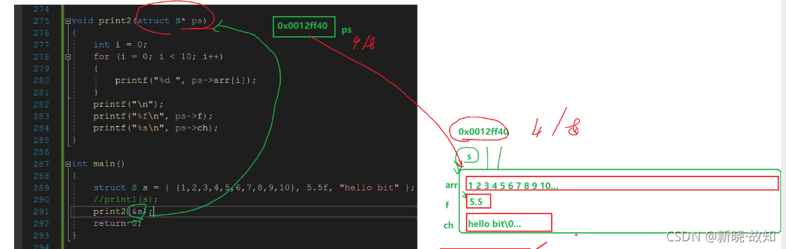 struct S { int arr[1000]; float f; char ch[100]; }; void print1(struct S tmp) { int i = 0; for (i = 0; i < 10; i++) { printf("%d ", tmp.arr[i]); } printf("\n"); printf("%f\n", tmp.f); printf("%s\n", tmp.ch); } void print2(struct S* ps) { int i = 0; for (i = 0; i < 10; i++) { printf("%d ", ps->arr[i]); } printf("\n"); printf("%f\n", ps->f); printf("%s\n", ps->ch); } int main() { struct S s = { {1,2,3,4,5,6,7,8,9,10}, 5.5f, "hello bit" }; //print1(s); print2(&s); return 0; }