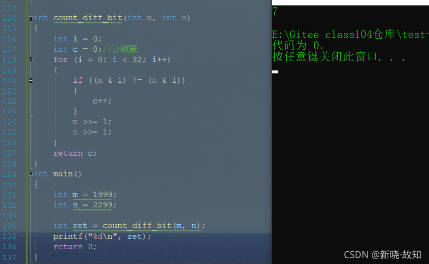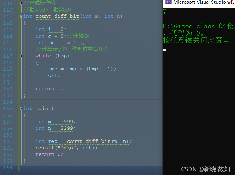 //异或操作符 //相同为0,相异为1 int count_diff_bit(int m, int n) { int i = 0; int c = 0;//计数器 int tmp = m ^ n; //计算tmp的二进制位中有几个1 while (tmp) { tmp = tmp & (tmp - 1); c++; } return c; } int main() { int m = 1999; int n = 2299; int ret = count_diff_bit(m, n); printf("%d\n", ret); return 0; }