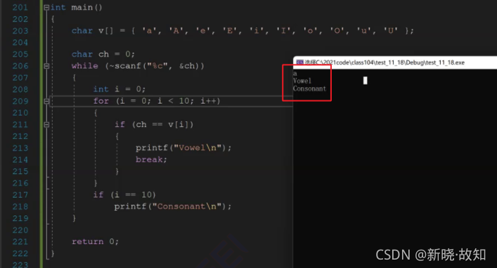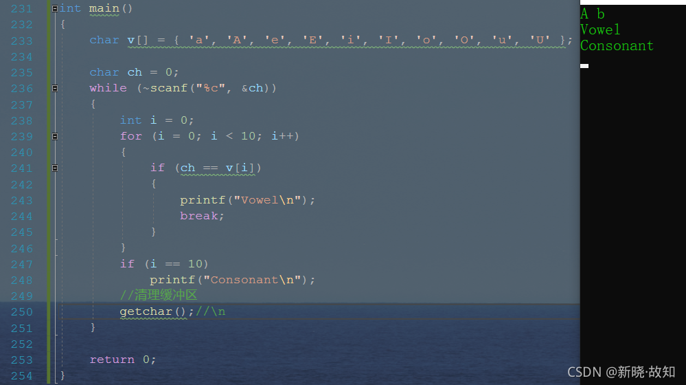 int main() { char v[] = { 'a', 'A', 'e', 'E', 'i', 'I', 'o', 'O', 'u', 'U' }; char ch = 0; while (~scanf("%c", &ch)) { int i = 0; for (i = 0; i < 10; i++) { if (ch == v[i]) { printf("Vowel\n"); break; } } if (i == 10) printf("Consonant\n"); //清理缓冲区 getchar();//\n } return 0; }