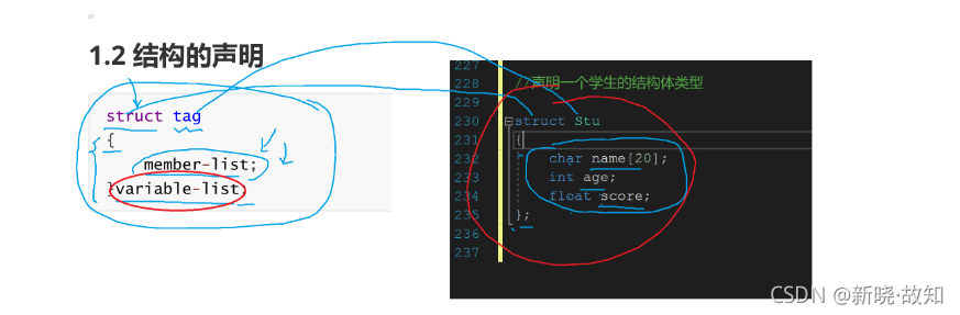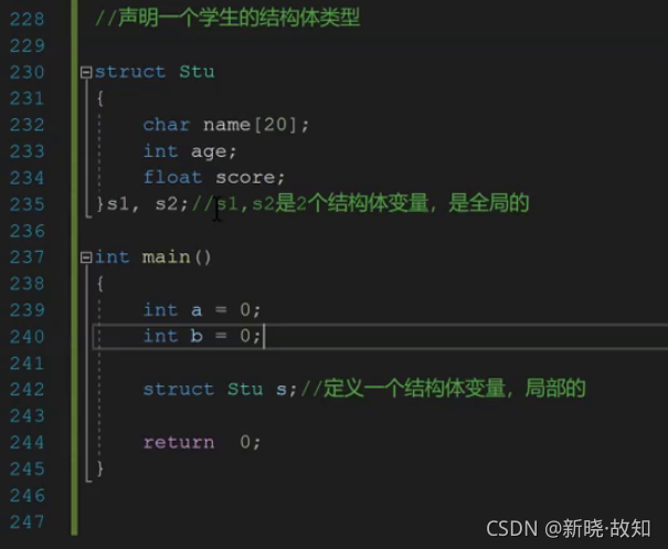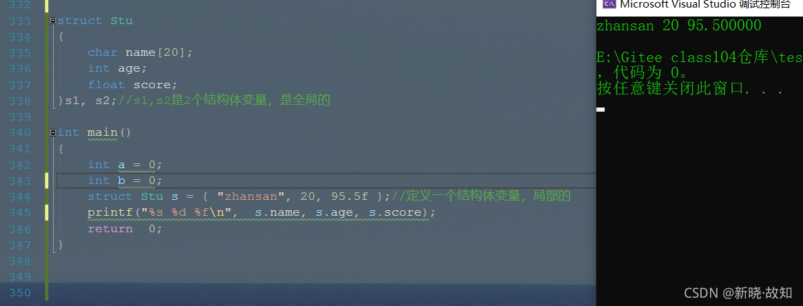 struct Stu { char name[20]; int age; float score; }s1, s2; s1,s2是2个结构体变量,是全局的 int main() { int a = 0; int b = 0 struct Stu s = { "zhansan", 20, 95.5f }; 定义一个结构体变量,局部的 printf("%s %d %f\n", s.name, s.age, s.score); return 0; }