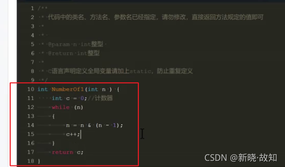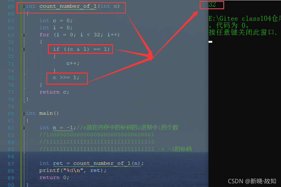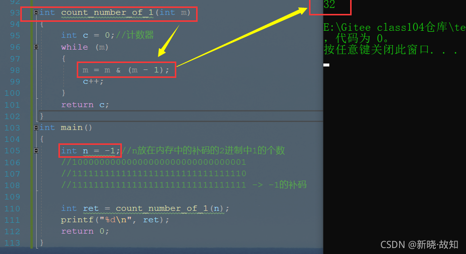 int count_number_of_1(int m) { int c = 0;//计数器 while (m) { m = m & (m - 1); c++; } return c; } int main() { int n = -1;//n放在内存中的补码的2进制中1的个数 //10000000000000000000000000000001 //11111111111111111111111111111110 //11111111111111111111111111111111 -> -1的补码 int ret = count_number_of_1(n); printf("%d\n", ret); return 0; }
