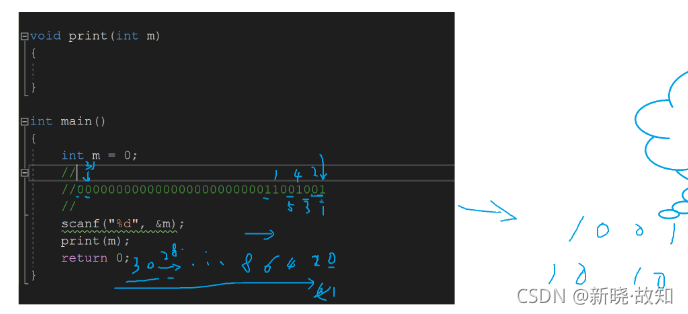 使用unsigned ,主函数中n为-1,是有符号位,但定义函数中的m不希望是有符号位,因此在将n传给m的时候,使用unsigned默认传过去的是无符号位的整数的补码,其所有的位都是有效位。