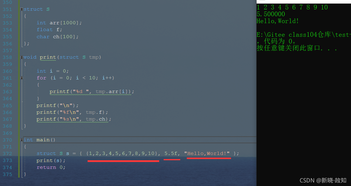 struct S { int arr[1000]; float f; char ch[100]; }; void print(struct S tmp) { int i = 0; for (i = 0; i < 10; i++) { printf("%d ", tmp.arr[i]); } printf("\n"); printf("%f\n", tmp.f); printf("%s\n", tmp.ch); } int main() { struct S s = { {1,2,3,4,5,6,7,8,9,10}, 5.5f, "Hello,World!" }; print(s); return 0; }