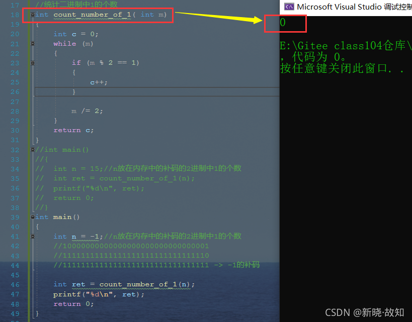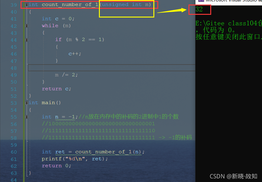 int count_number_of_1(unsigned int m) { int c = 0; while (m) { if (m % 2 == 1) { c++; } m /= 2; } return c; } int main() { int n = -1;//n放在内存中的补码的2进制中1的个数 //10000000000000000000000000000001 //11111111111111111111111111111110 //11111111111111111111111111111111 -> -1的补码 int ret = count_number_of_1(n); printf("%d\n", ret); return 0; }