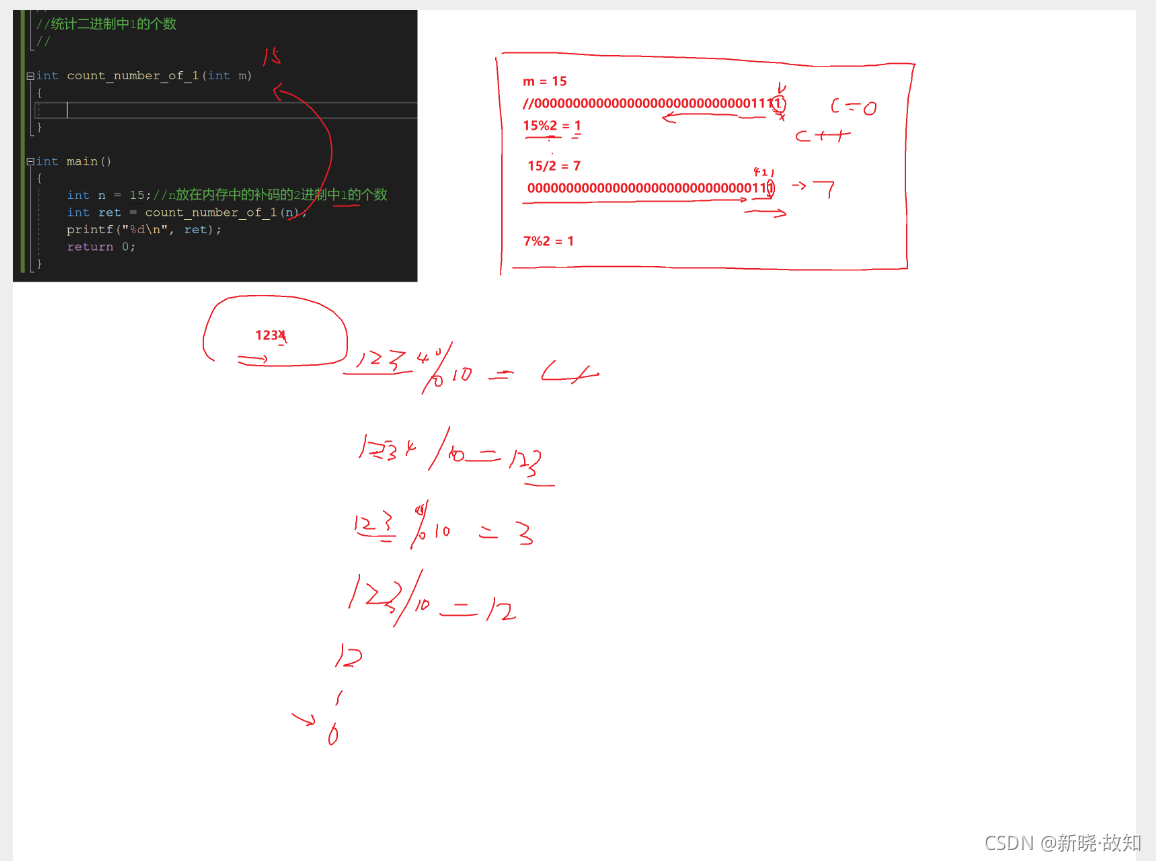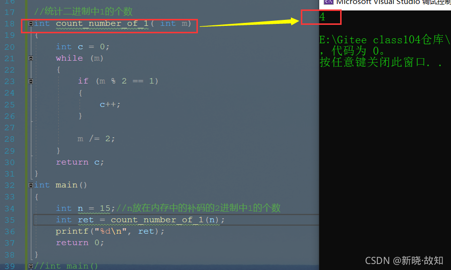 统计二进制中1的个数 int count_number_of_1( int m) { int c = 0; while (m) { if (m % 2 == 1) { c++; } m /= 2; } return c; } int main() { int n = 15;//n放在内存中的补码的2进制中1的个数 int ret = count_number_of_1(n); printf("%d\n", ret); return 0; }
