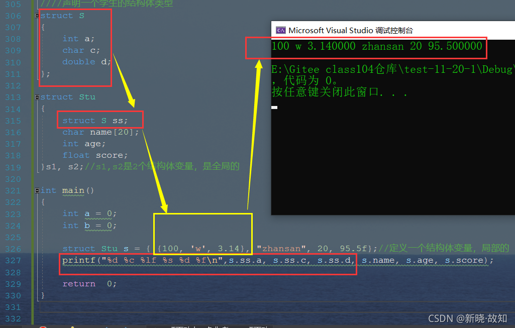struct S { int a; char c; double d; }; struct Stu { struct S ss; char name[20]; int age; float score; }s1, s2;//s1,s2是2个结构体变量,是全局的 int main() { int a = 0; int b = 0; struct Stu s = { {100, 'w', 3.14}, "zhansan", 20, 95.5f};//定义一个结构体变量,局部的 printf("%d %c %lf %s %d %f\n",s.ss.a, s.ss.c, s.ss.d, s.name, s.age, s.score); return 0; }