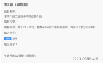 int count_diff_bit(int m, int n) { int i = 0; int c = 0;//计数器 for (i = 0; i < 32; i++) { if ((m & 1) != (n & 1)) { c++; } m >>= 1; n >>= 1; } return c; } int main() { int m = 1999; int n = 2299; int ret = count_diff_bit(m, n); printf("%d\n", ret); return 0; }