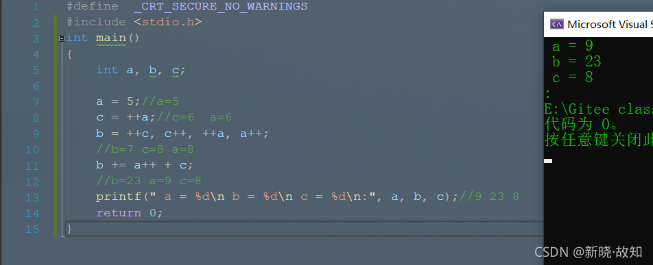 #include <stdio.h> int main() { int a, b, c; a = 5;//a=5 c = ++a;//c=6 a=6 b = ++c, c++, ++a, a++; //b=7 c=8 a=8 b += a++ + c; //b=23 a=9 c=8 printf(" a = %d\n b = %d\n c = %d\n:", a, b, c);//9 23 8 return 0; }