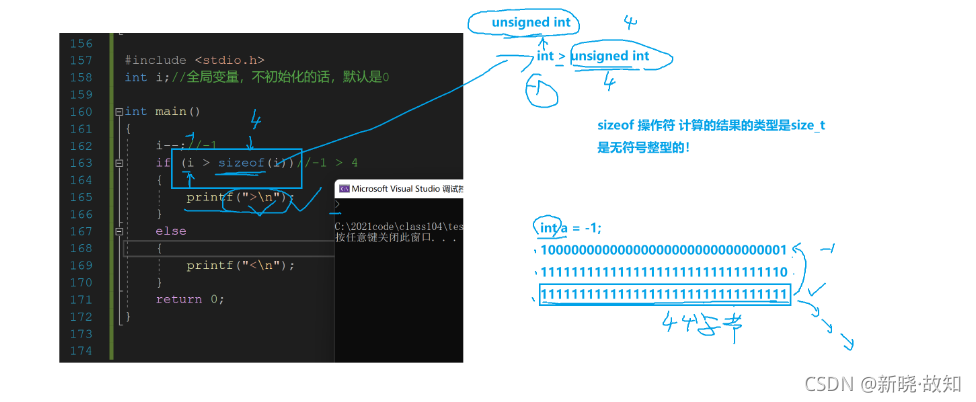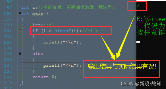 int i;//全局变量,不初始化的话,默认是0 int main() { i--;//-1 if (i > sizeof(i))//-1 > 4 { printf(">\n"); } else { printf("<\n"); } return 0; }
