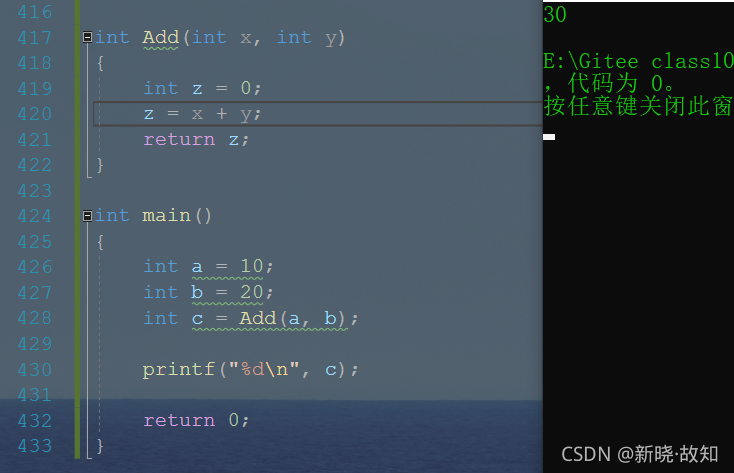int Add(int x, int y) { int z = 0; z = x + y; return z; } int main() { int a = 10; int b = 20; int c = Add(a, b); printf("%d\n", c); return 0; }