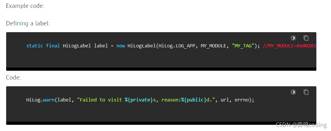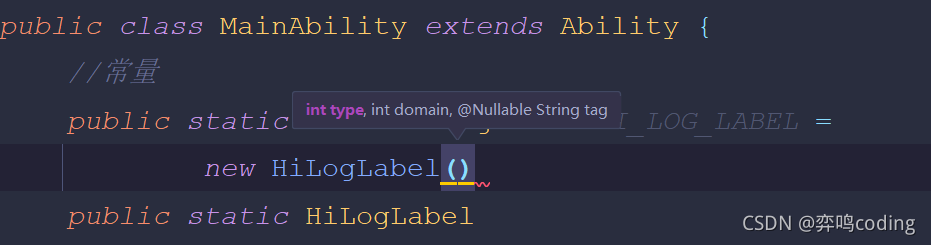 所以我们要使用HiLog就得先注册标签,然后定义常量 HiLogLabel label,再然后打印信息,比如图上的警告信息,我们就把lable放进去