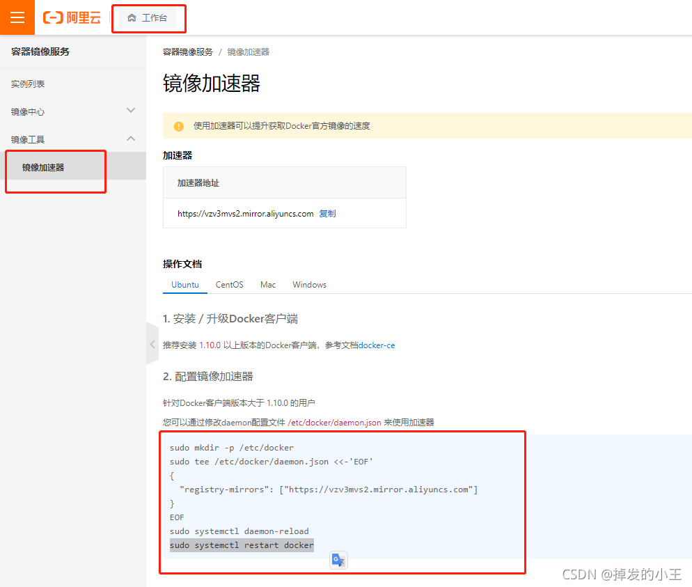 # 创建文件 sudo mkdir -p /etc/docker # 修改配置, 设置镜像 sudo tee /etc/docker/daemon.json <<-'EOF' { "registry-mirrors": ["https://vw9qapdy.mirror.aliyuncs.com"] } EOF # 重启后台线程