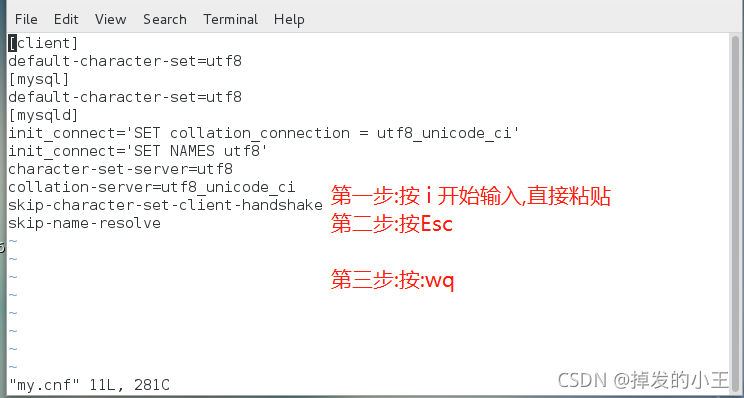 vim /mydata/mysql/conf/my.cnf # 创建并进入编辑