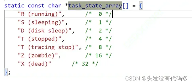 static const char * const task_state_array[] = { "R (running)", /* 0 */ "S (sleeping)", /* 1 */ "D (disk sleep)", /* 2 */ "T (stopped)", /* 4 */ "t (tracing stop)", /* 8 */ "X (dead)", /* 16 */ "Z (zombie)", /* 32 */ };