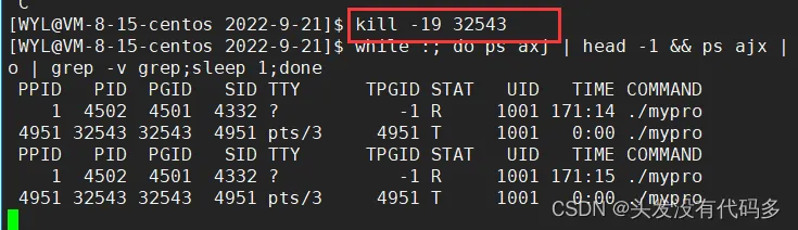 输入kill -19 PID,程序变为T状态,T状态是停止状态,这就说明S可中断
