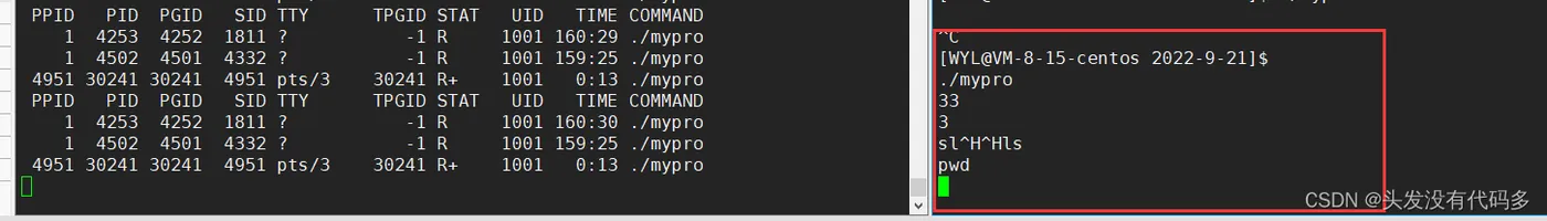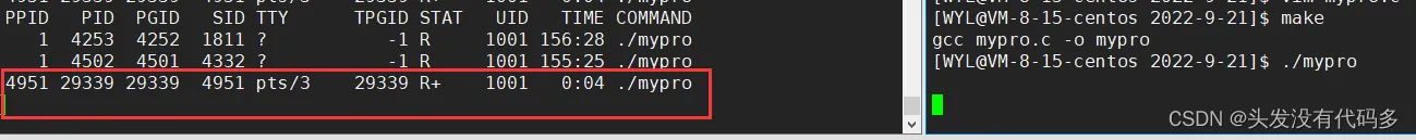 while :; do ps axj | head -1 && ps ajx | grep mypro | grep -v grep;sleep 1;done