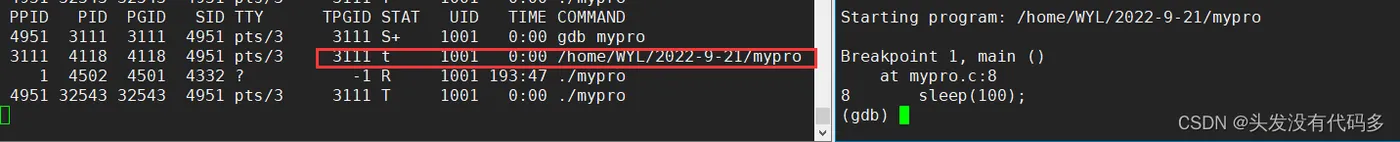 T停止状态(stopped): 可以通过发送 SIGSTOP 信号给进程来停止(T)进程。这个被暂停的进程可以通过发送 SIGCONT 信号让进程继续运行。