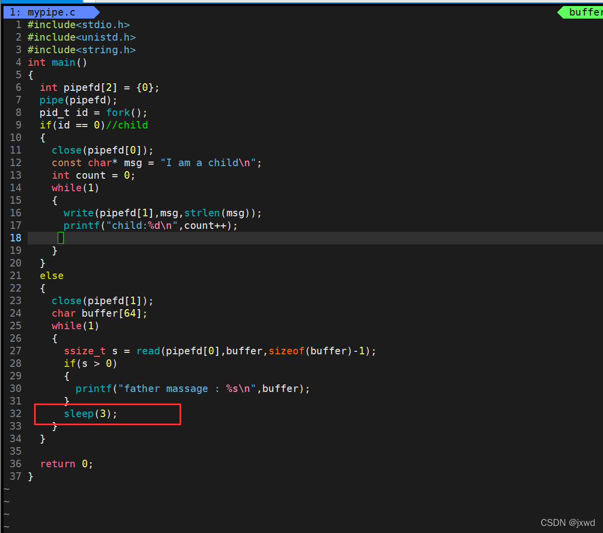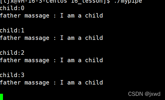 1 #include<stdio.h> 2 #include<unistd.h> 3 #include<string.h> 4 int main() 5 { 6 int pipefd[2] = {0}; 7 pipe(pipefd); 8 pid_t id = fork(); 9 if(id == 0)//child 10 { 11 close(pipefd[0]); 12 const char* msg = "I am a child\n"; 13 int count = 0; 14 while(1) 15 { 16 write(pipefd[1],msg,strlen(msg)); 17 printf("child:%d\n",count++); 18 sleep(3); 19 } 20 } 21 else 22 { 23 close(pipefd[1]); 24 char buffer[64]; 25 while(1) 26 { 27 ssize_t s = read(pipefd[0],buffer,sizeof(buffer)-1); 28 if(s > 0) 29 { 30 printf("father massage : %s\n",buffer); 31 } 32 } 33 } 34 35 return 0; 36 }