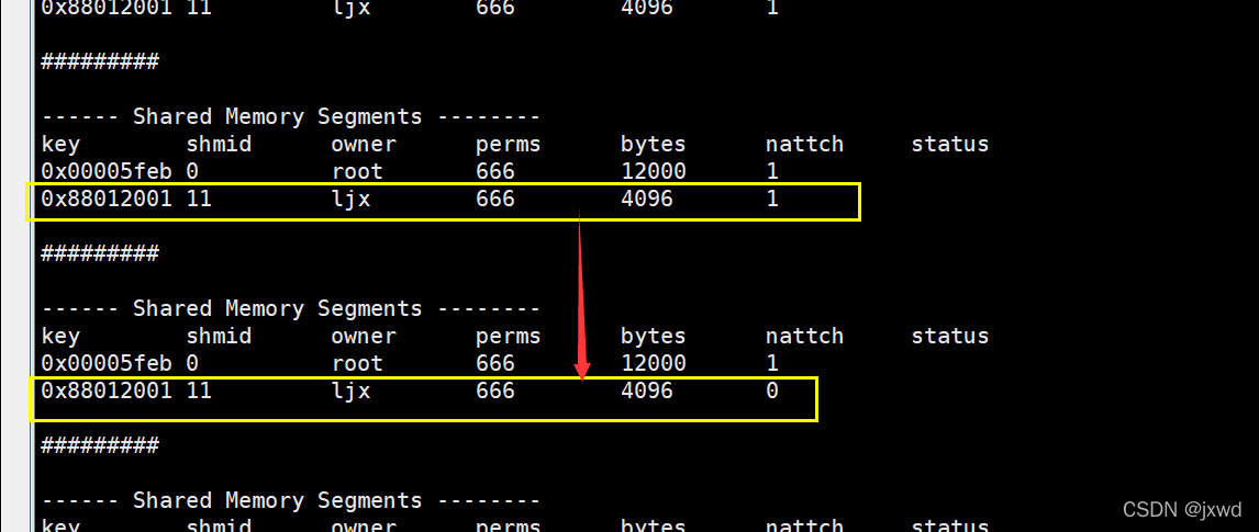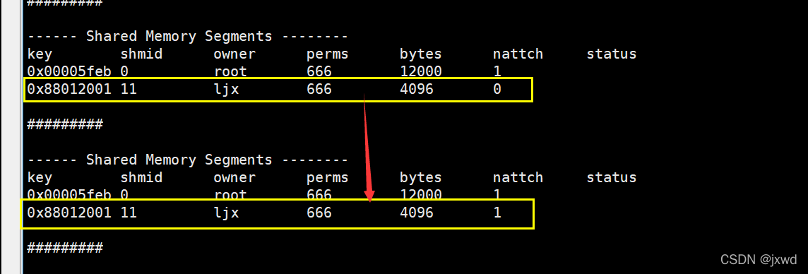 当然了,我们这里还可以做一个监测,就是检测后台的共享内存的关联数。(关联数先由0变成1再变成2最后再变成0,我们这里就不过多举例了)