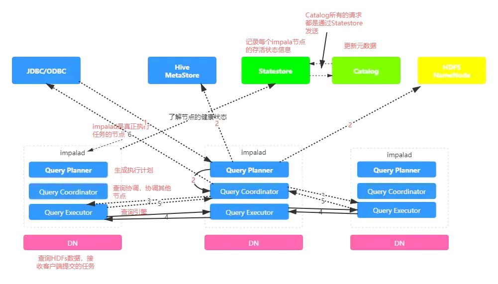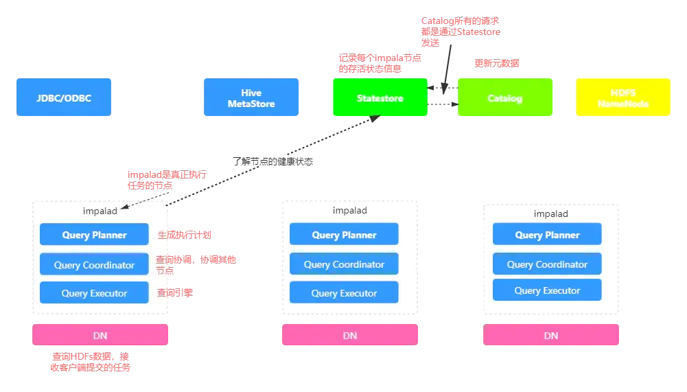 statestore 只需在集群的某一个主机上运行,负责检查集群中所有 DataNode 上的 impalad 状态,并不断地将其结果转发给每个守护进程