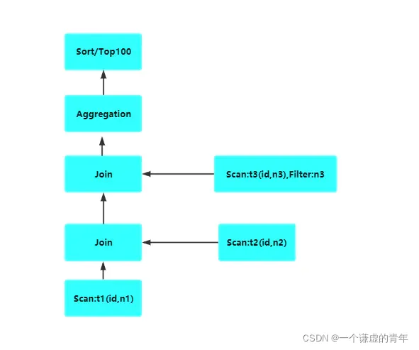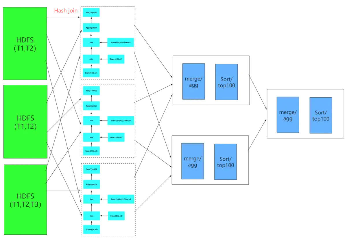 T1,T2,T3 Join 之后再根据 Group by 执⾏本地的预聚合,每⼀个节点的预聚合结果只是最终结果的⼀部分(不同的节点可能存在相同的group by的值),需要再进⾏⼀次全局的聚合