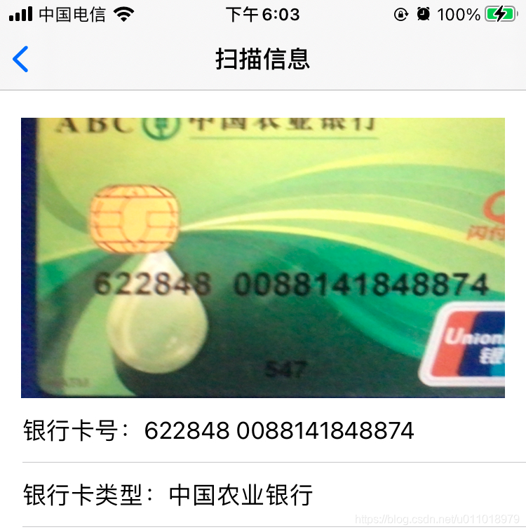 - 功能:扫描银行卡识别信息( 银行名称、 银行卡号)并截取银行卡图像