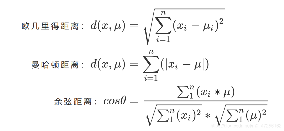 样本间距离计算方式有:欧式距离、余弦相似度、曼哈顿距离,一般来说采用欧式距离,对于文本可能会使用余弦相似度。