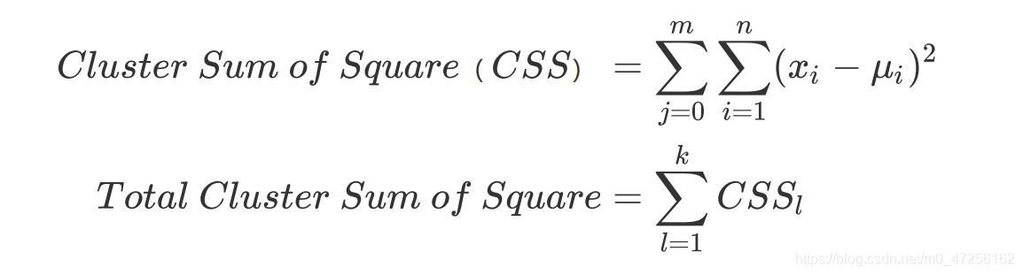 如果我们采用欧几里得距离,则一个簇中样本点到中心距离的平方和为: