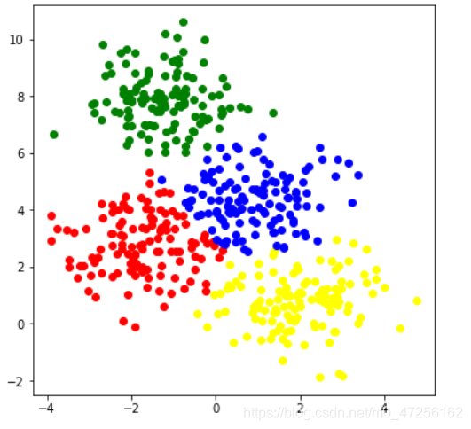 import pandas as pd from sklearn.datasets import make_blobs x,y=make_blobs(n_samples=500,n_features=2,centers=4,random_state=123)