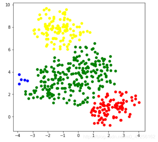 #采用 DBSCAN from sklearn.cluster import DBSCAN dbs=DBSCAN(min_samples=5) dbs.fit(x) label_dbs=dbs.labels_ color=['red','green','yellow','blue'] plt.figure(figsize=(6,6)) for i in range(4): plt.scatter(x[label_dbs==i]['特征1'],data[label_dbs==i]['特征2'],c=color[i]) plt.show()