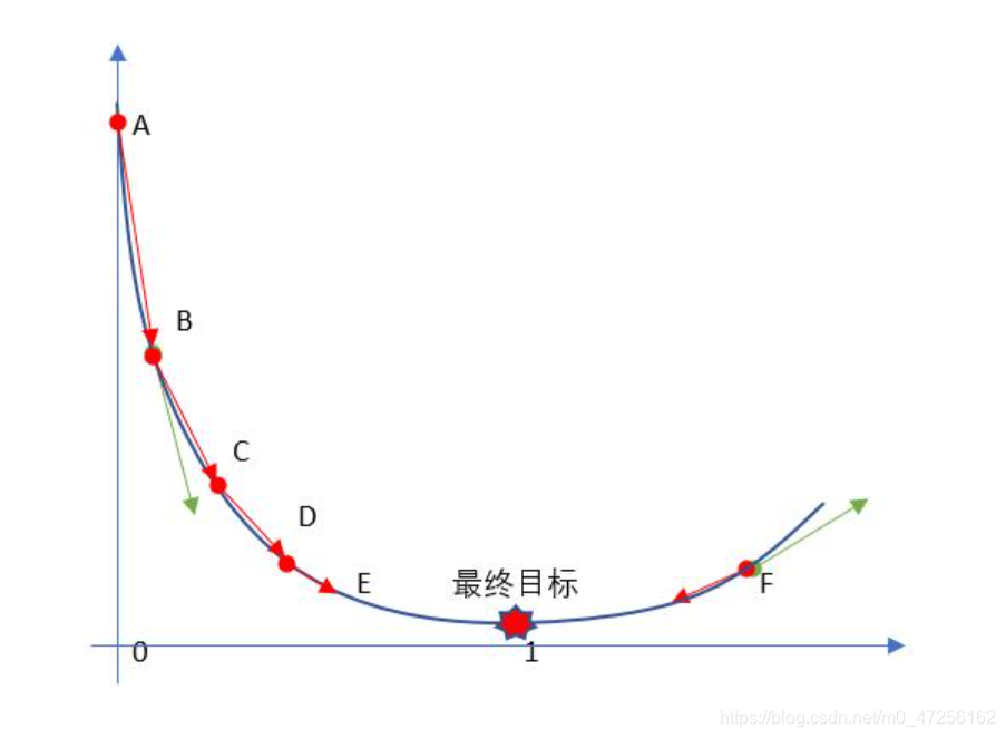 对于F点来说,F点的梯度为绿色向量的方向,那么它的反方向即为下降最快的地方