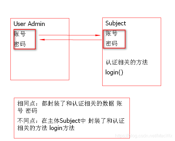 主体Subject:就是Admin,User这些类,但是和之前自己定义的User Admin稍以后区别,Subject不仅封装用户和认证相关的数据(账号密码),还封装了和认证相关的方法(login方法)